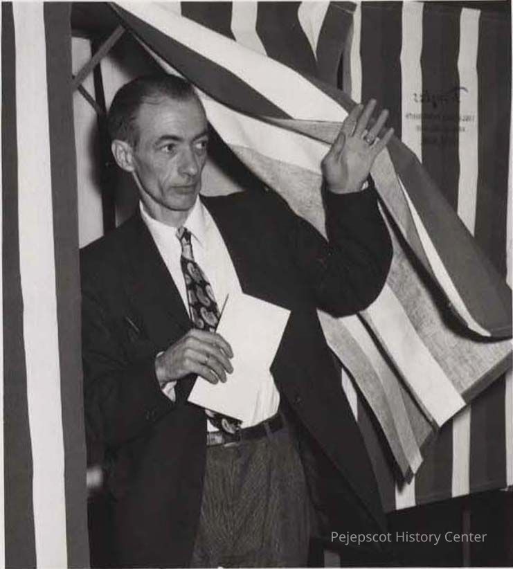 An undated black and white photo of Everett Giles,leaving a voting booth. Written on the back is "Battle by Ballot."