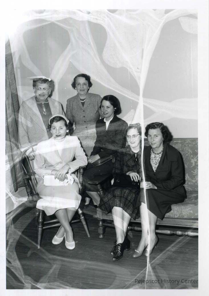 Executive Board of the Women's Alliance of the First Parish Church. Seated: Mrs. Charles Wilkes, Mrs. Ralph Allen, Mrs. Gerald Rose, Mrs. Eugene Wakely. Standing: Mrs. Aramandel Stanley, Mrs. Eban Morse. 6/5/55