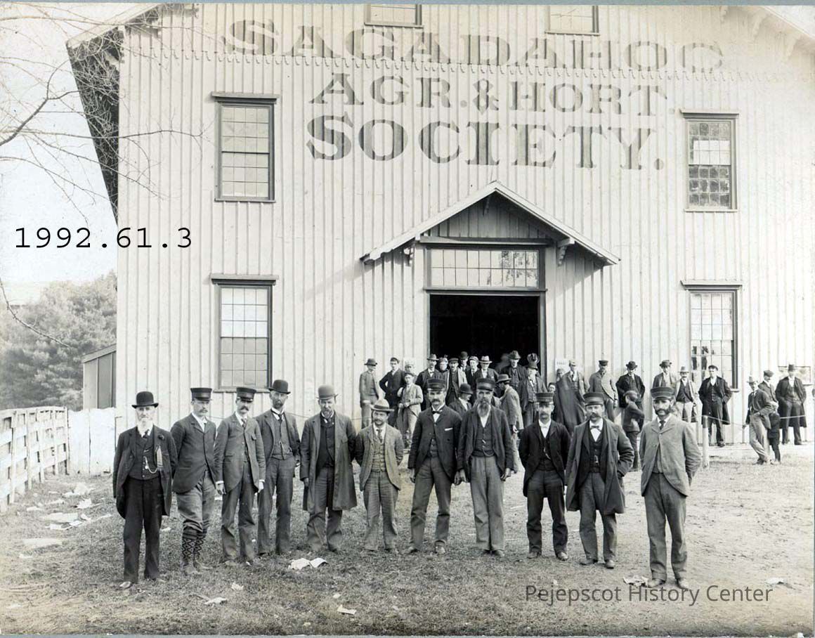 A sepia print on 8 X 12 mat with Sagadahoc Agricultural and Horticultural Society members in the foreground.