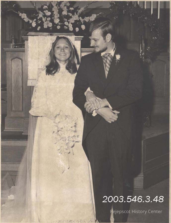 A black and white wedding photograph of F. Ernest Stallworth and Donna Ralene Overcast Stallworth. The married in Charlotte, N.C. Stallworth was a reporter for The Bath-Brunswick Times Record in Maine, where the photograph was published on 9/4/1970.