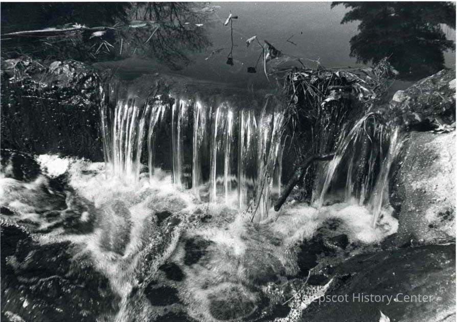 A B/w photo of the falls in Simpson Brook near the River Road, Topsham. 9/1983.