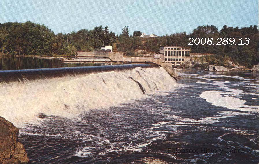A color picture postcard of the Falls on the Androscoggin River. It is taken from the Brunswick side looking toward Topsham. The Topsham generating station can be seen. Postcard unused. UndatedCollection
