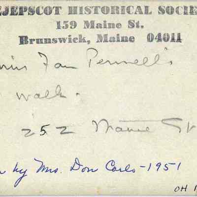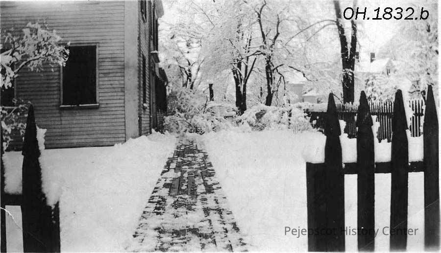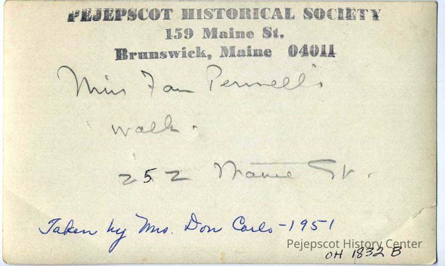 A B/W photograph of Miss Fan Pennell's walk leading to the door on the north side of 252 Maine Street, Brunswick, ME. Dated 1951.