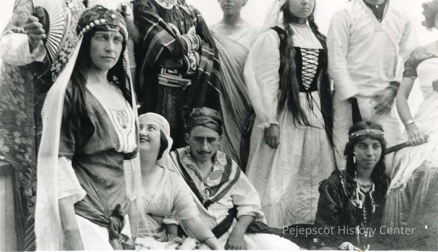 B/W photo titled, "Fancy Dress Ball". A group of "summer" people costumed for a summer theatrical at Bailey Island, early 20th century. People are dressed in historically inaccurate, stereotypical Native American and Middle Eastern dress. No date.