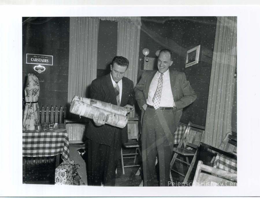 B/W photo of Richard J. Gayer, Town Engineer, and Merle F. Goff, Town Manager, at a farewell party for Goff. Gayer appears to be holding 2 pieces of white birch wood. Goff is looking on and laughing (10/2/1955)