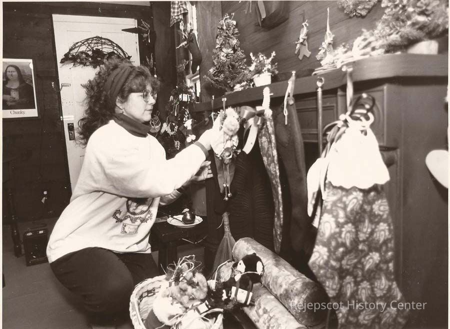 A B/W photograph of a girl working in the Farmers Daughter a gift shop once located at 855 Lewiston Road (highway 196), Topsham, Me. 04086.Lexicon