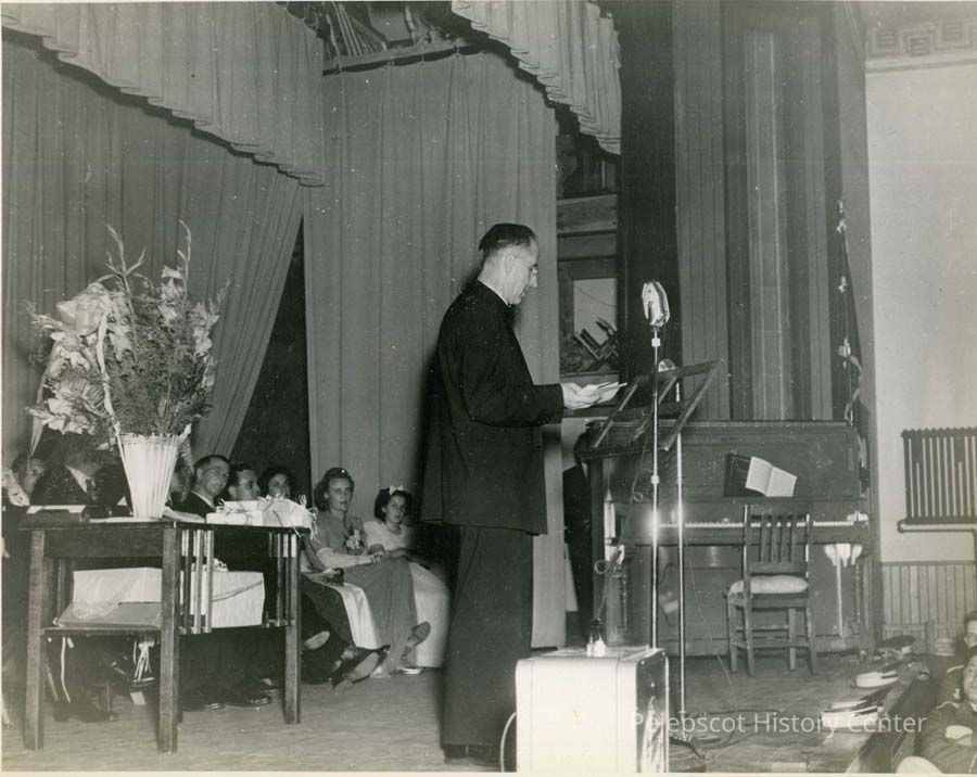 A B/W photograph Father Dauphin at a microphone in the basement of the St. John's Church. Undated