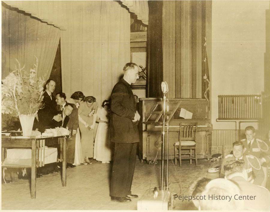 A B/W photograph of Father Dauphin standing at a microphone in the basement of St. John's Church. Undated