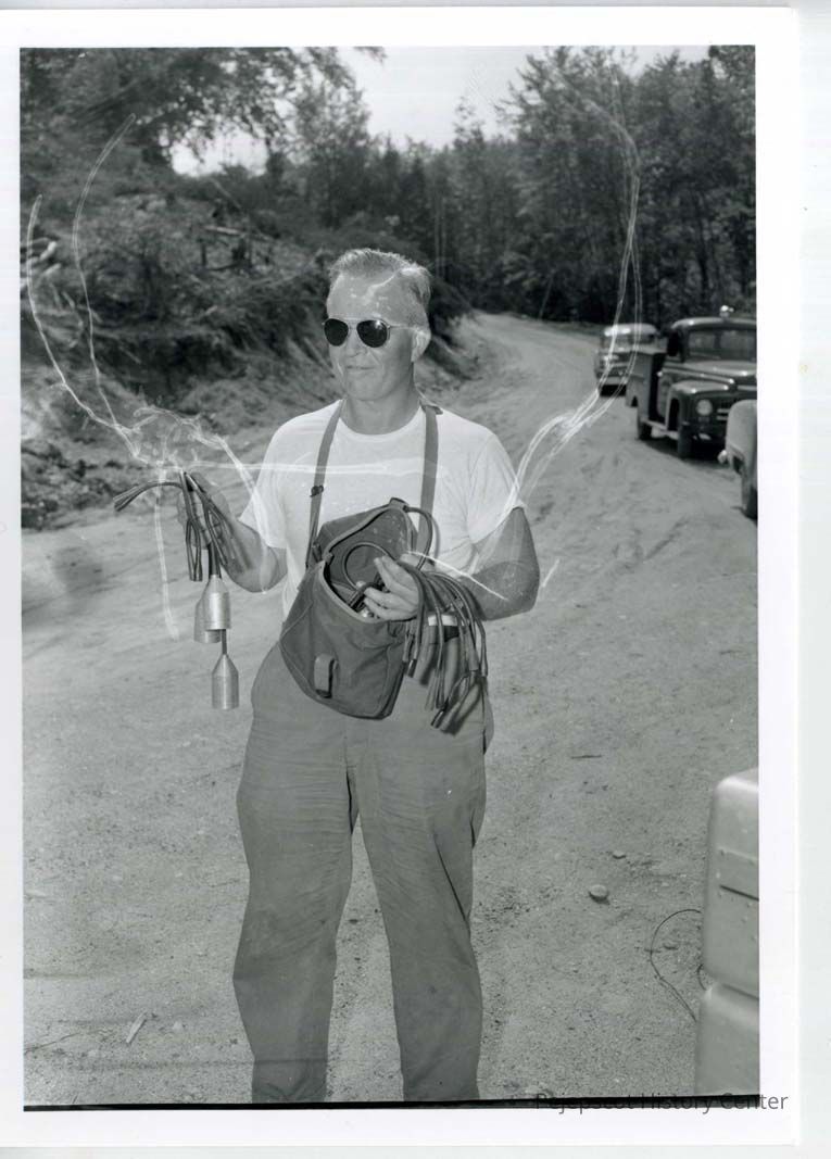 Father John Lenehan stands holding his equipment to test for possible water sources in Brunswick. This test was made at the gravel pit on the Durham Road in July, 1951.