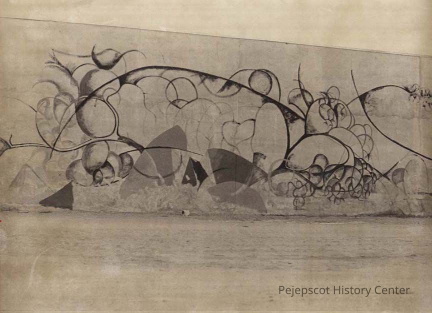 A black and white photograph of a mural painted on the exterior of Fayva Shoe Store at Cook's Corner. The mural was painted by artists Dave Rosenthal and Andy Swift. This photo was published in the Times Record on 12/16/1976.