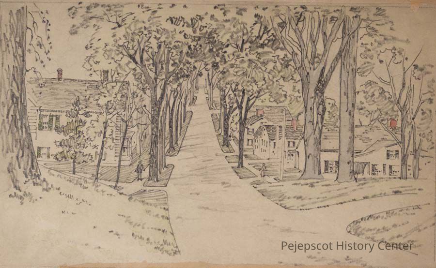 A B/W drawing of Federal Street. Someone has gone through and colored the chimneys red.
