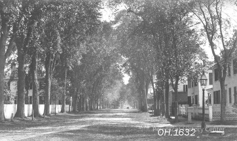A B/W photo of an unpaved Federal Street, Brunswick, ME. Taken from near Mason Street. There is a street lamp on the right and hitching posts on both sides of street. The street is lined with Elm trees. Photo taken by Reed & Preble. Dated 1889.