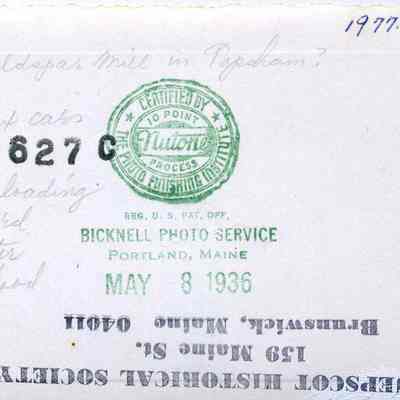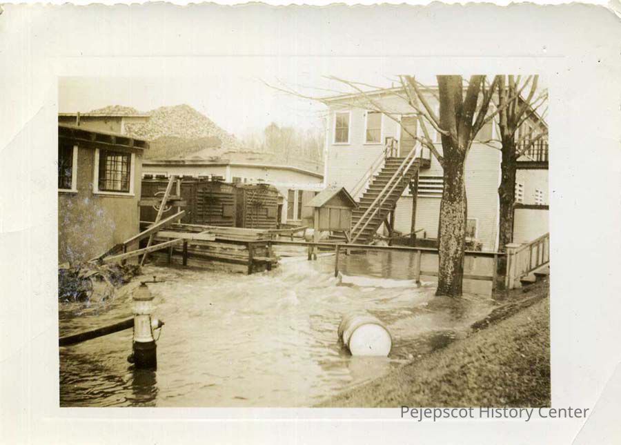 A B/W photo of a Pejepscot Paper Mill in Pejepscot. Boxcars in the loading yard after the flood. Dated May 8, 1936.