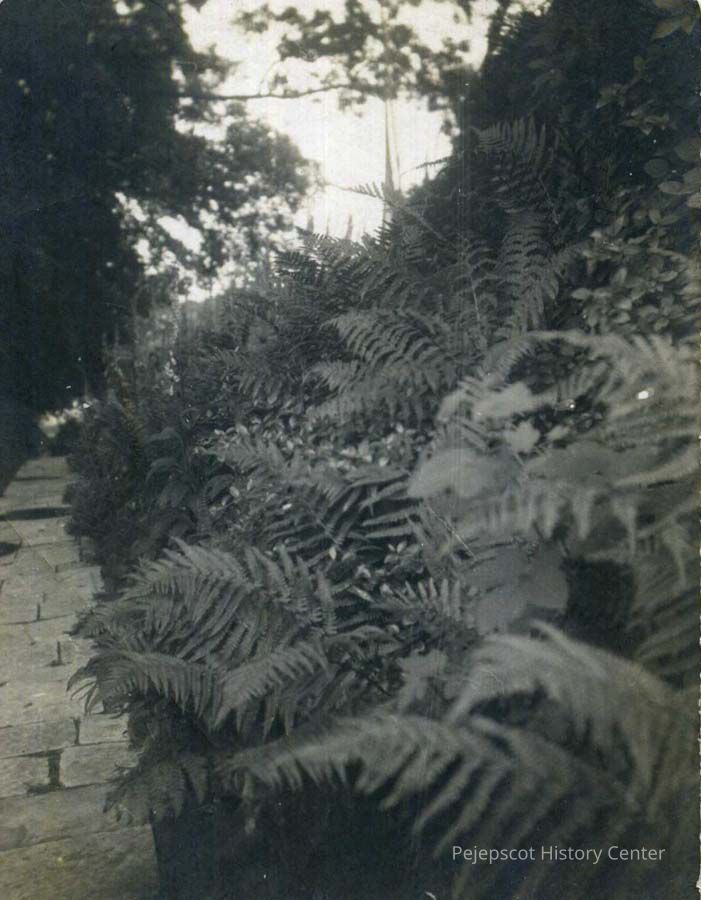 An undated black and white photograph of a fern bank. Writing on the back says "Fern bank foot of gardens." Kenworth, England.
