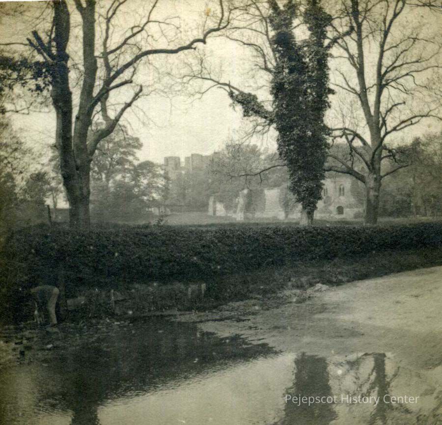 An undated black and white photograph of the field across the road from Wantage. A man can be seen washing a dog on the bottom left and the castle is in the background. The writing on the back says "a field across the road near Wantage - man washing dog at the left view of castle."