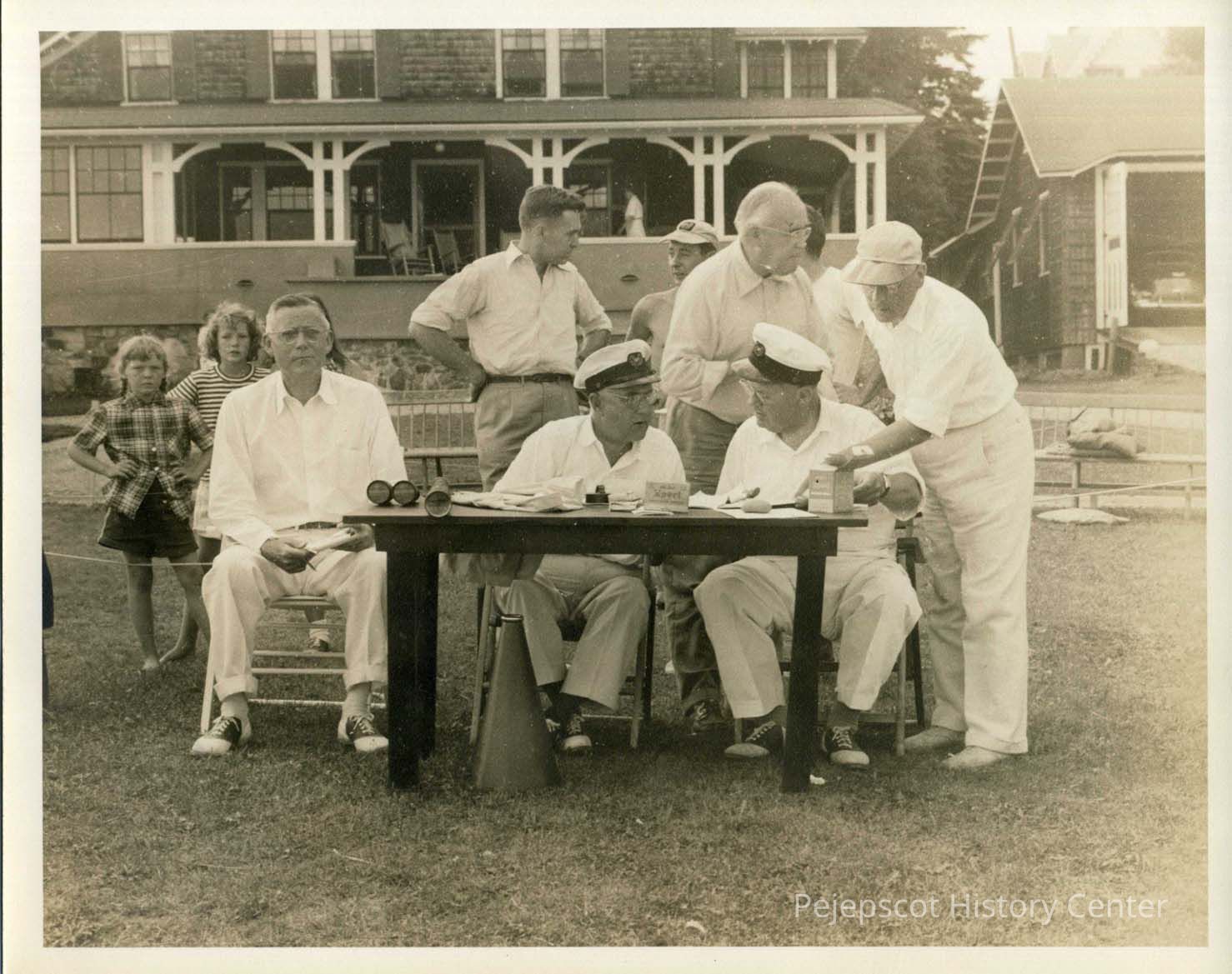 On the back of the photo it says " Wm. Ireland married Mary Elliot, daughter of Dr. Elliot who owned house on corner of Maine and Pleasant Street - he tended half the town through the 1917/18 flu epidemic. The younger girls may be Marilyn Ireland Cobb and her sister Priscilla." The picture was taken in front of Files Cottage on Mere Point and shows a group of older men sitting or standing around a table in the front yard of the cottage. Undated