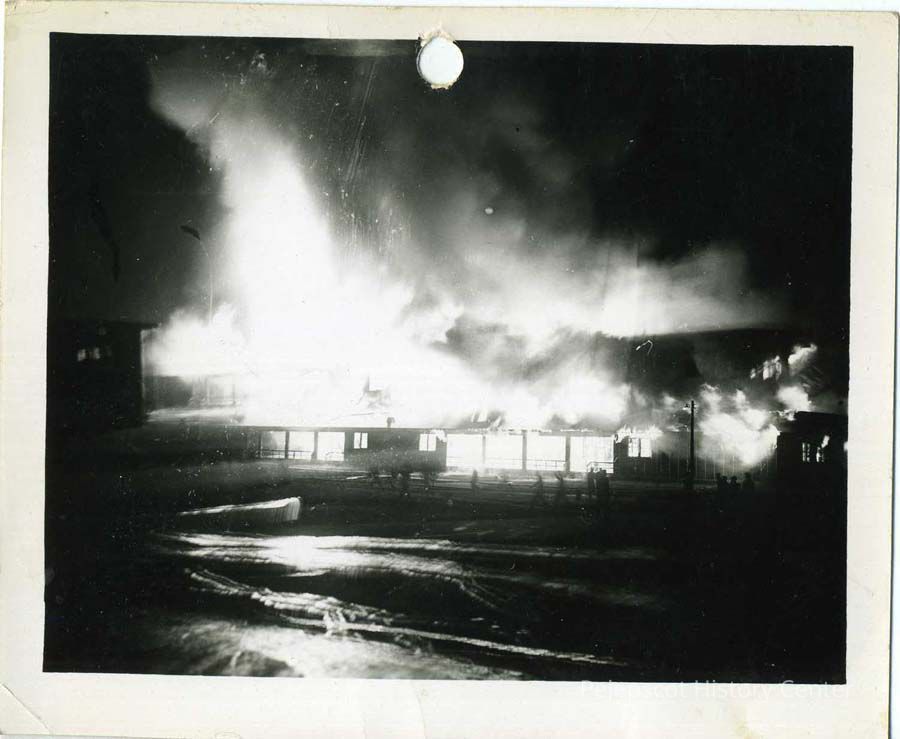 A black & white photograph of a burning fire at an unknown location. Undated.
