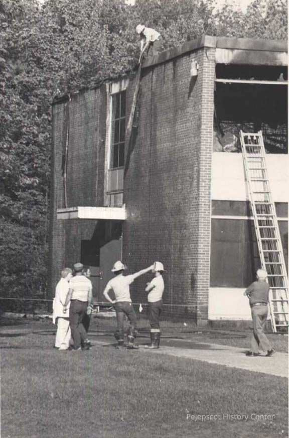 A B/W photograph of the fire at Brunswick Jr. High School. Undated