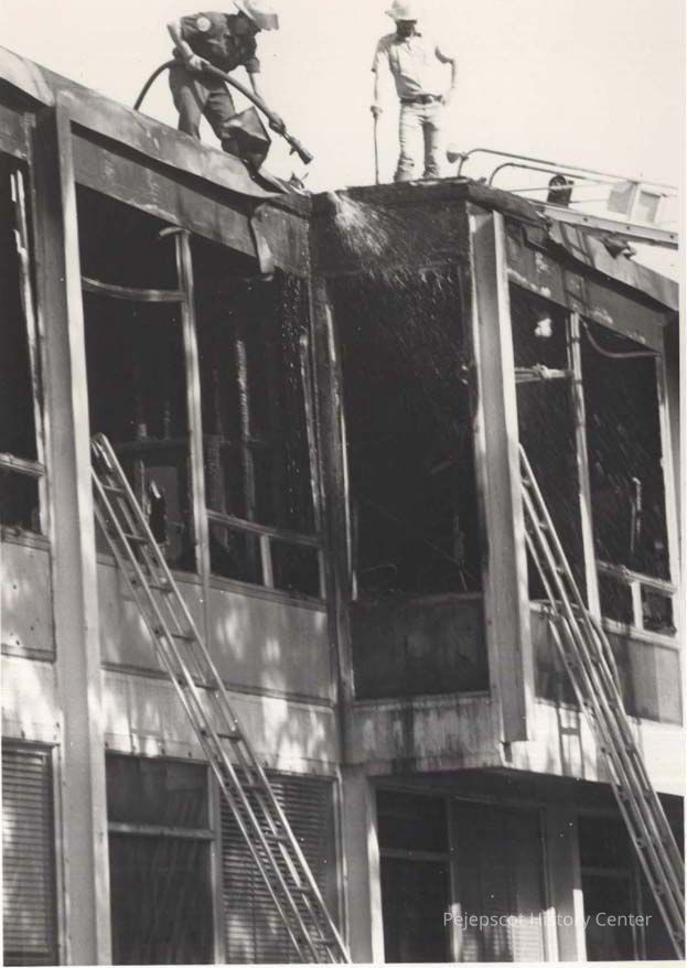 A B/W photograph of the fire at Brunswick Jr. High School. Undated