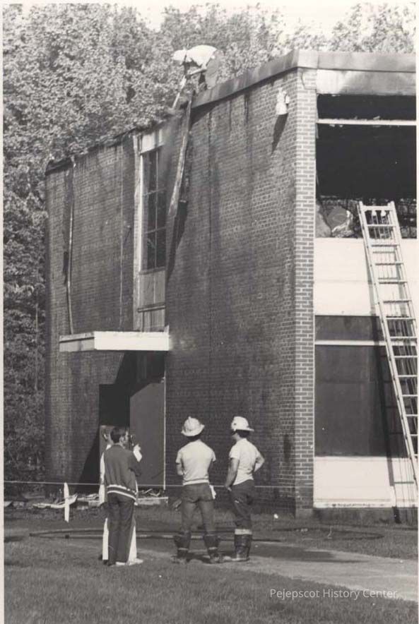A B/W photograph of the fire at Brunswick Jr. High School. Undated