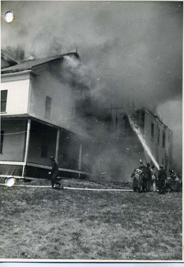 A black & white photograph of a fire at the Joshua Lawrence Chamberlain summer home, Domhegan, on Simpson's Point Road, Brunswick, ME. Firefighters can be seen hosing the house from the ground. Part of a collection of photographs of local fires, collected by former Brunswick Fireman Alfred LeTarte.