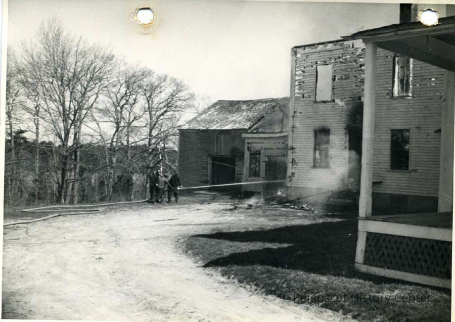 A black & white photograph of a fire at the Joshua Lawrence Chamberlain summer home, Domhegan, on Simpson's Point Road, Brunswick, ME. Firemen can be seen hosing the house as the fire stops. Part of a collection of photographs of local fires, collected by former Brunswick Fireman Alfred LeTarte.