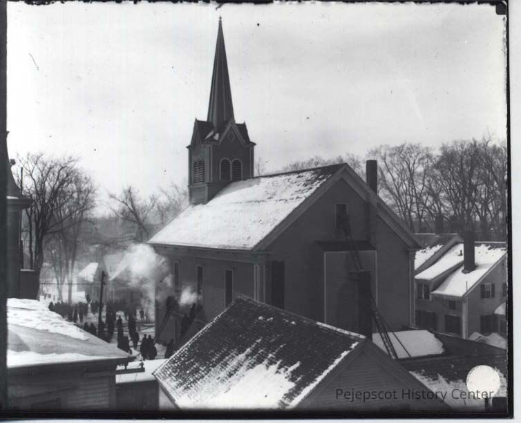 Photo of a 1917 fire at the First Methodist Church at Pleasant Street, Brunswick, Maine. The church was built in 1866. The congregation moved to Church Road in 1988, and the church at 4 Pleasant Street was sold and used for other purposes.