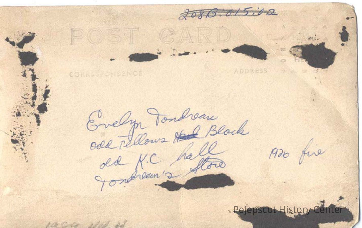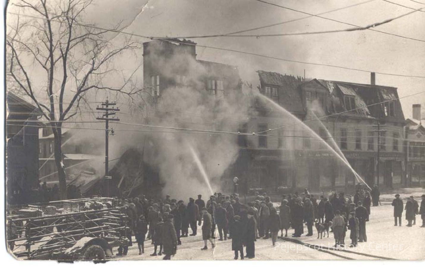 B/W photo of the fire in the Odd Fellow's Block at the corner of Maine and Pleasant Streets in 1926. This fire consumed the Tondreau Store and damaged the Knights of Columbus Hall.
