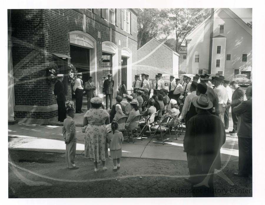 B/W photo of a group of people, seated and standing, in front of the fire station at a memorial service by the Fire Dept. Two wreaths are on the fire station.
