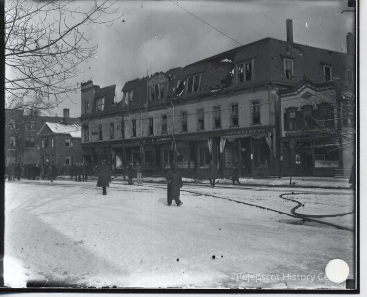 Photo of a fire that destroyed the Odd Fellows Block around 1926, Maine Street, Brunswick, Maine.