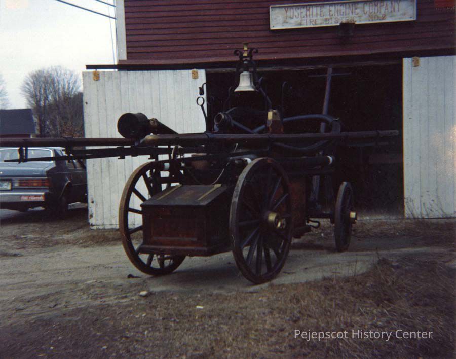 A B/W photograph of fire engine Yosemite No. 2. This engine was originally built for Brunswick, Maine, 6/23/1849. It was known as Niagara No. 3. It was sold in 1868 to Chester, Vt. There in 1983 it was known as Yosemite No. 2.