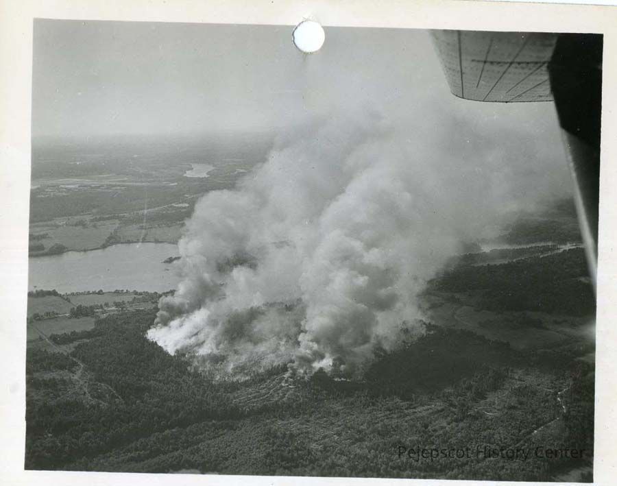A black & white aerial photograph of a large fire in West Bath, ME. The New Meadows River can be seen behind the smoke. Dated July 5, 1953.