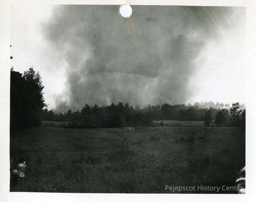 A black & white photograph of a fire in West Bath, ME. Dated July 5, 1953.