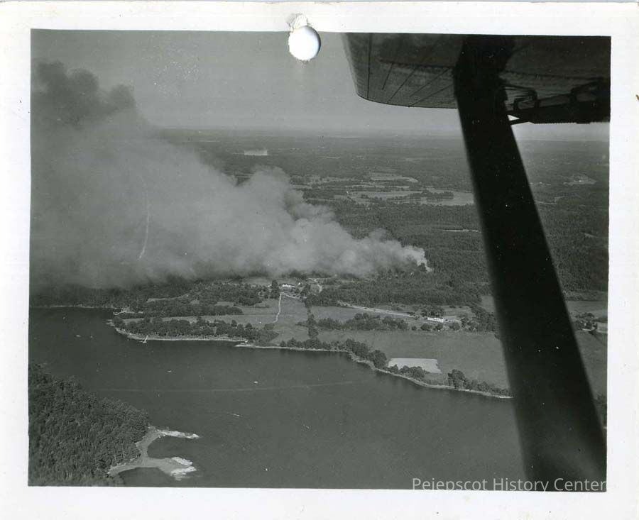 A black & white aerial photograph of a large fire in West Bath, ME. The New Meadows River can be seen as the smoke moves across. Dated July 5, 1953.