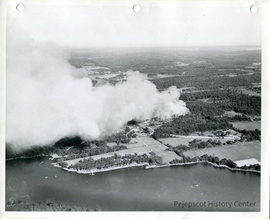 A black & white aerial photograph of a large fire in West Bath, ME. Dated July 5, 1953.