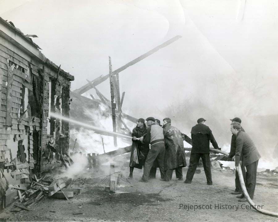 B/W photo of a fire on River Road, Brunswick, ME. Burt Whitman is standing on the far right holding the hose. No date.