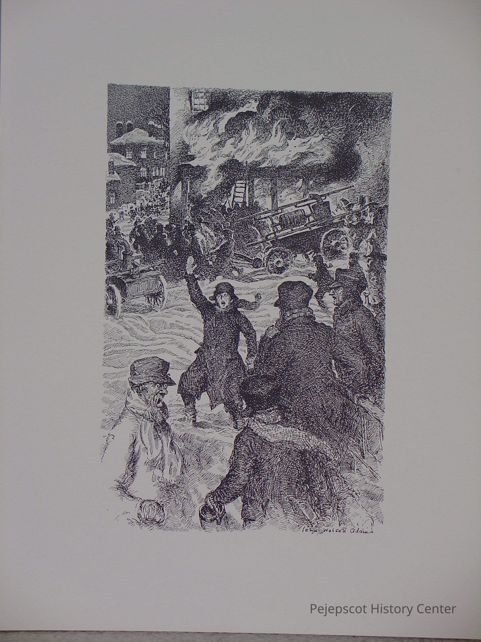 Unframed B&W print of a fire scene (burning of the Tontine?), the hand pumper just arriving, and a boy with raised hand in the foreground, by John Wolcott Adams. UndatedCollection