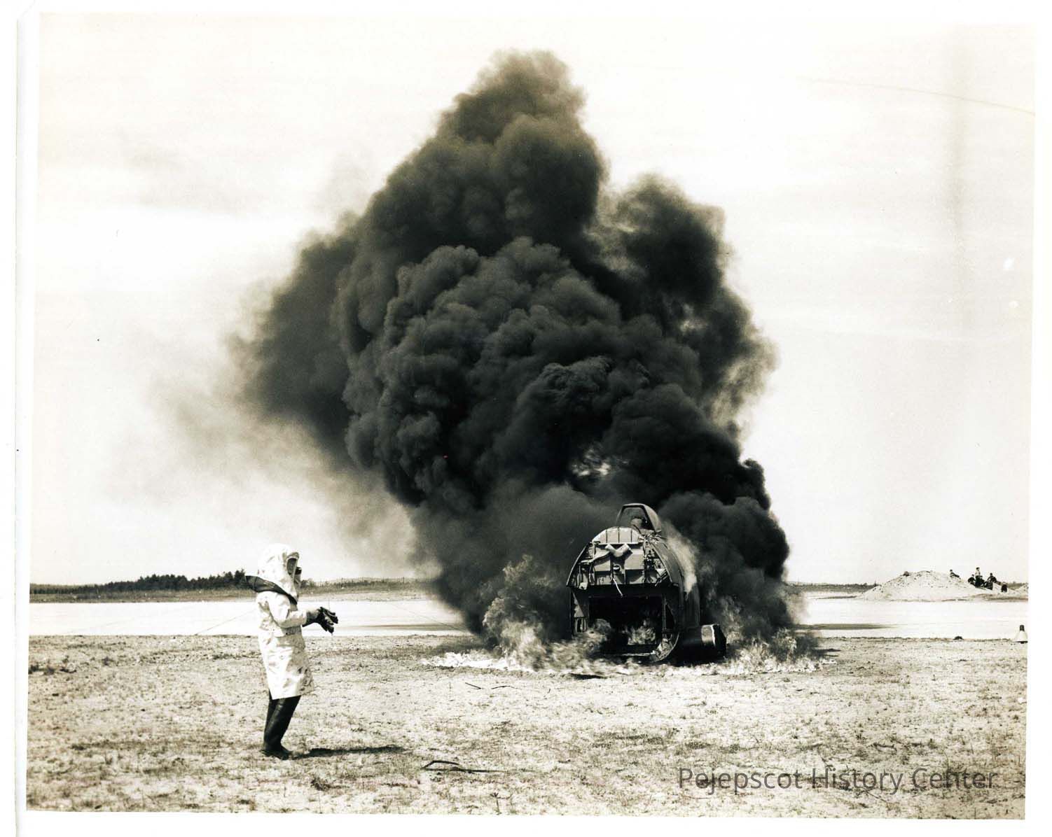 Fire on the fusilage of an airplane which as part of a fire training exercise on BNAS. Undated