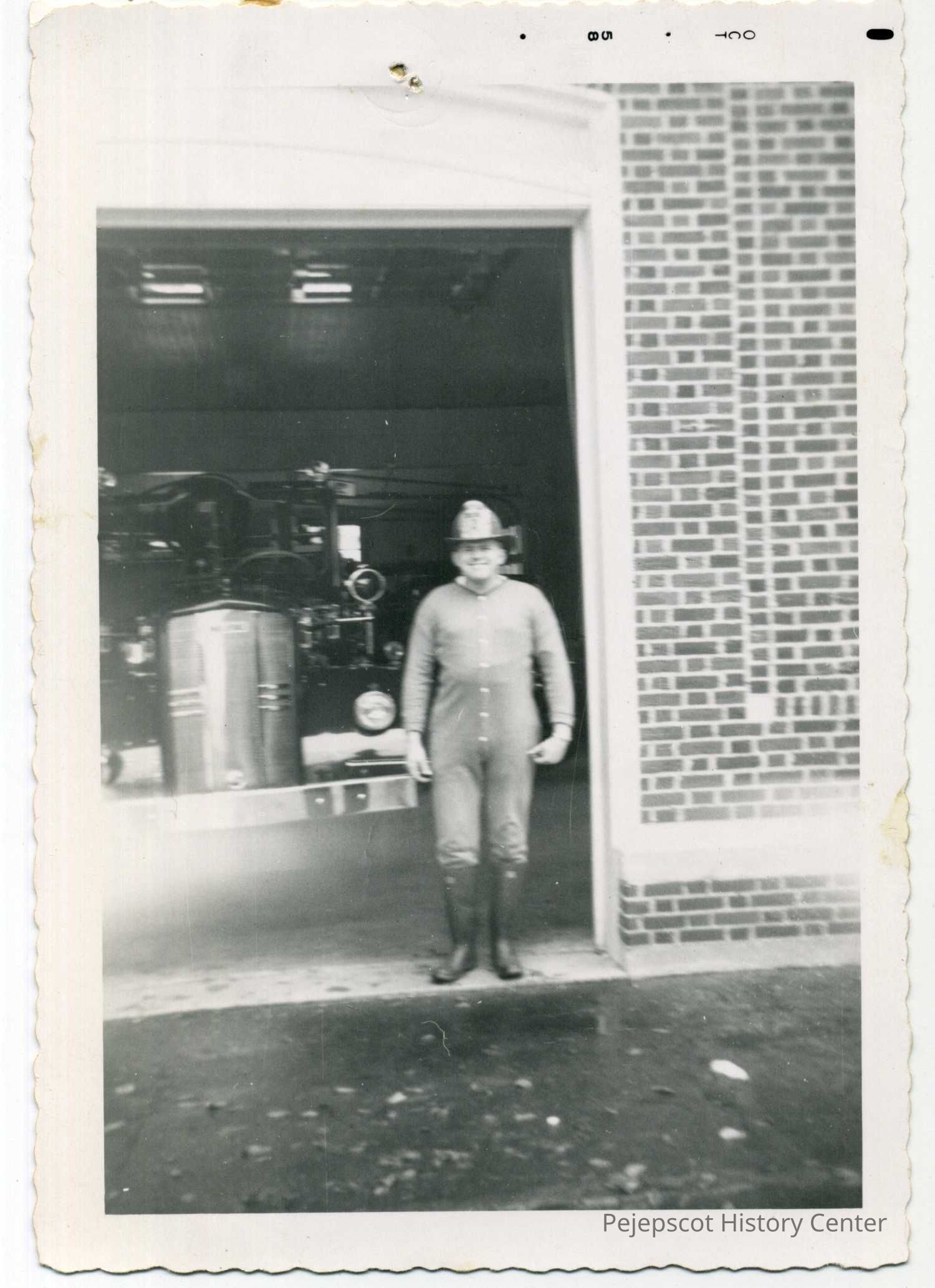 An undated black and white photograph of a fireman in long drawers.