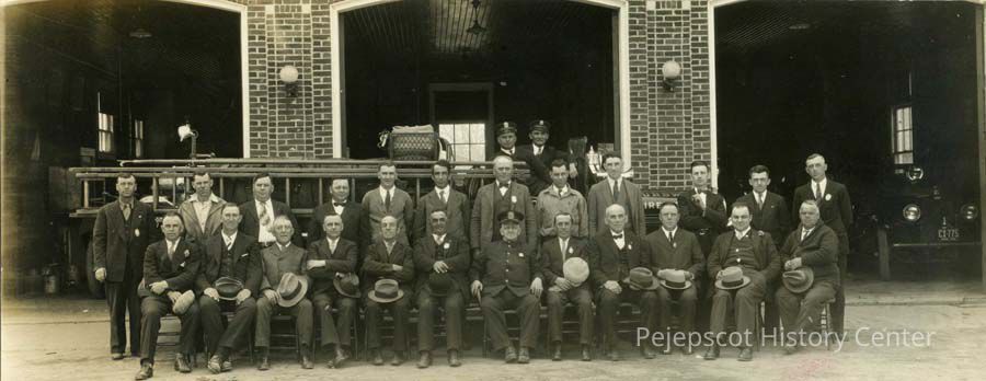 A B/W group photograph of fireman and police in front of the Brunswick Fire Station. Undated