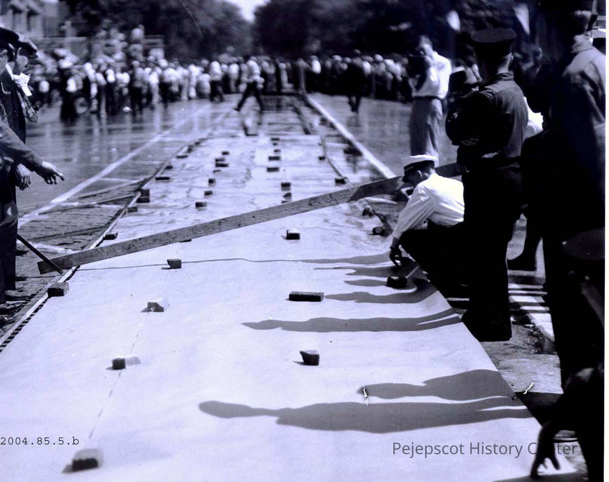 A B/W photograph of the Fireman's Muster held in celebration of Brunswick's Bicentennial, July 4, 1939, on Maine Street.