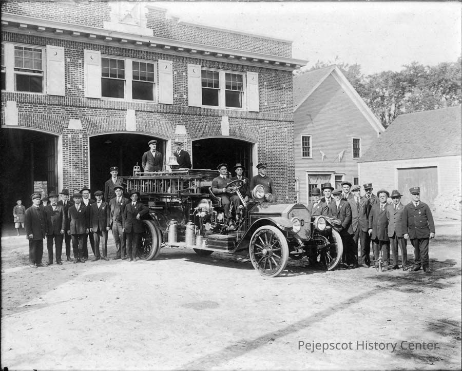A B/W photographic view of a group of firemen around a fire truck (American LaFrance Chemical truck, circa 1919) Billy Edwards is standing on the passenger side of the truck. Edward Gamache is the driver.