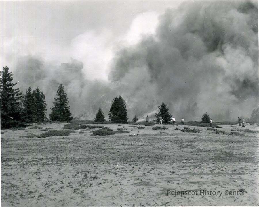 A B/W photograph of fireman fighting the Hillside to Base Fire. The fire was started by a train at Hillside. It jumped Harpswell Road and ended up on the Base. Undated