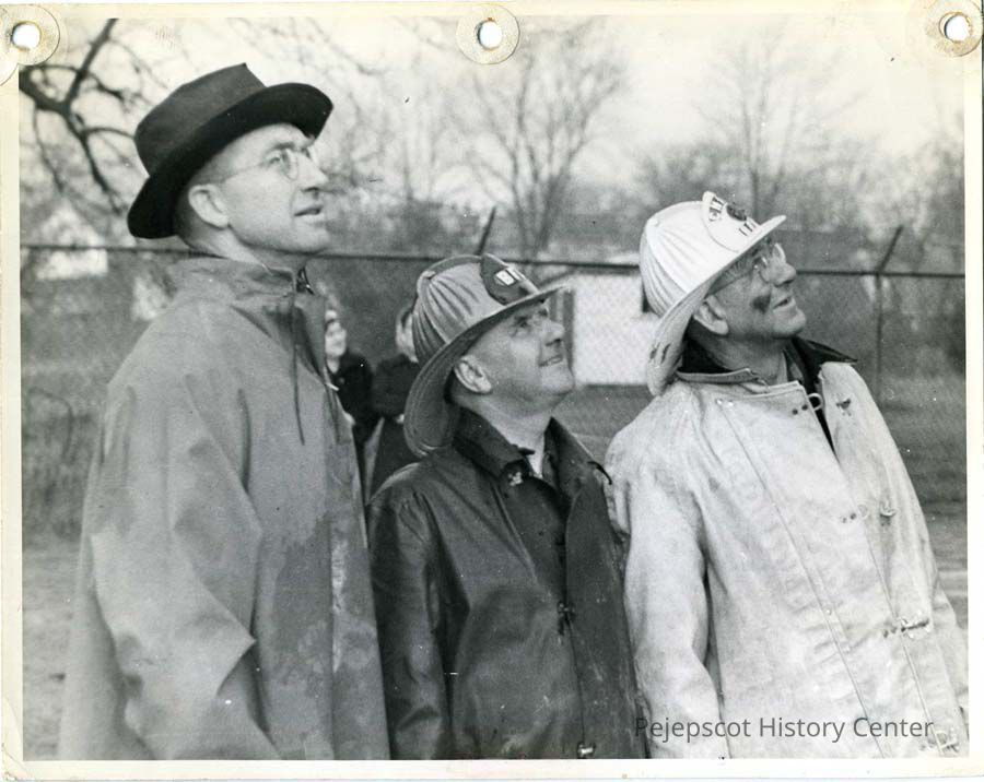A black & white photograph of Adam Walsh, Ludger Tetu, and Harold Nickerson looking at a fire at St. John's Catholic School on Pleasant Street, Brunswick, ME. The fireman in the white coat is identified as Harold Nickerson. Two women can be seen behind them.