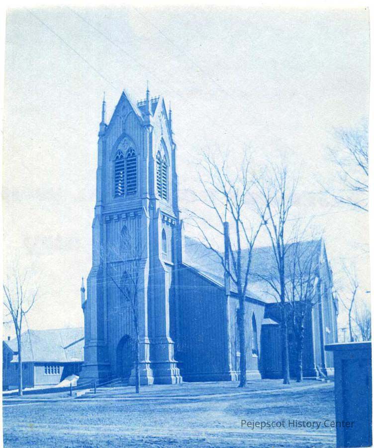 Blue finish photograph of the First Parish Church, Brunswick in the early 1900s.
