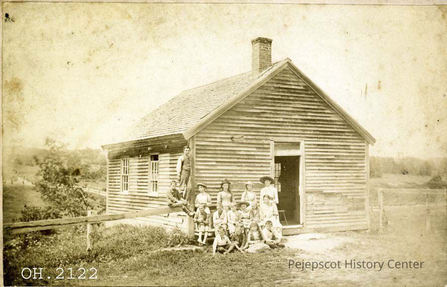 A B/W photograph with the teacher and students in front of First District School on Church Road. Dated 1849 on