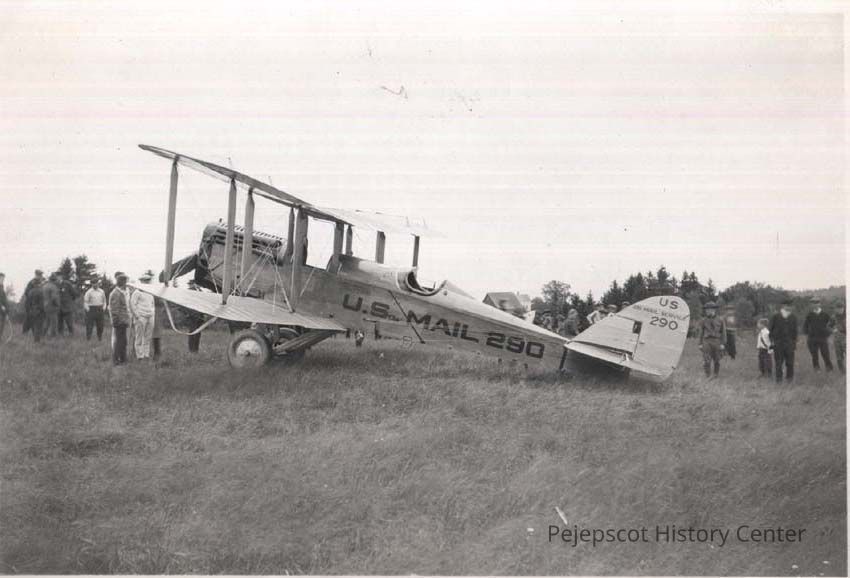 The first airplane to deliver mail to Brunswick landed on 6/12/1922 at the new Brunswick Aviation field off River Road near the golf course. Written on the back of the photo is, "Later in the day the plane ran into a fence on take off and eventually had to be disassembled and shipped to available source of repairs. Parts were non available in Brunswick and vicinity."