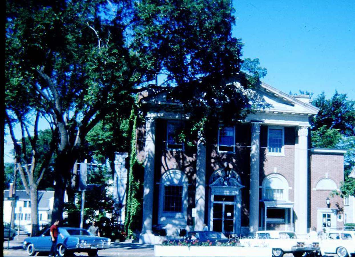 A color 35 mm slide of the First National Bank on Maine Street. 1966