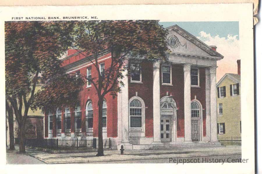 Postcard view of First National Bank, Brunswick, Maine. Date unknown.