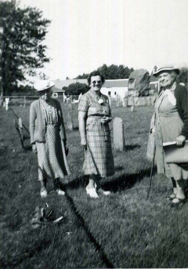 B/W photo of Fannie Woodside, Alice Toothaker, and Blanche Bryant at the First Parish Cemetery. No date.